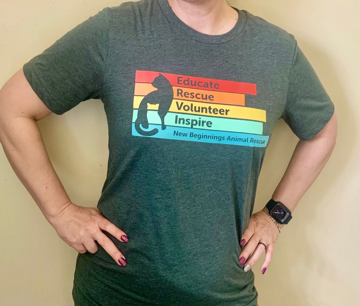 Educate. Rescue. Volunteer. Inspire. Our newest design features a gorgeous 5-colored call to action message on a heathered forest green t-shirt.